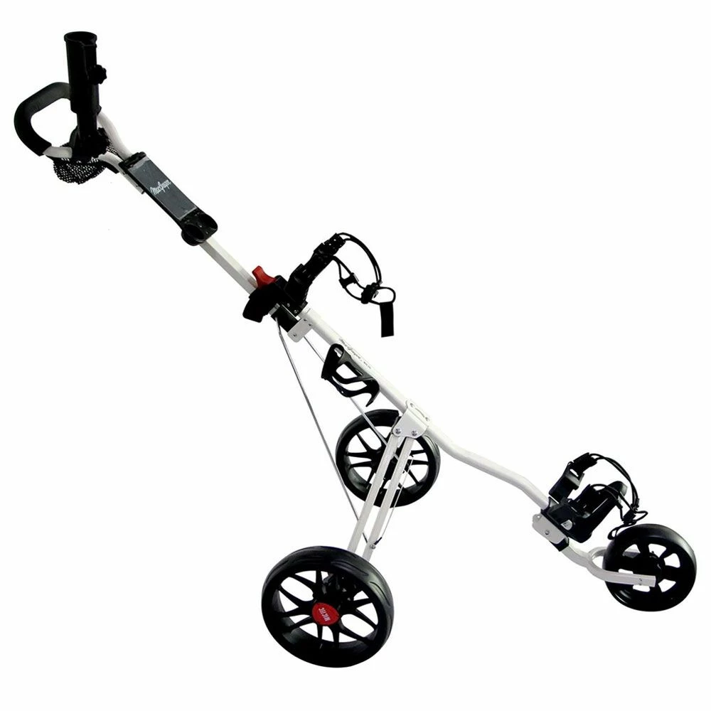 The MacGregor 3-wheel push trolley has a sporty and sturdy design, with adjustable bag supports to accommodate even the largest of golf bags. It has Quickfold-technology for fast and easy folding and the cart includes with purchase the umbrella holder, drinks holder, storage net and scorecard holder that enables quick access to your scorecard pencil and balls – unlike most leading brands. Other features include a foot parkin brake and the third front wheel that folds under the cart to reduce the size of the cart in storage.